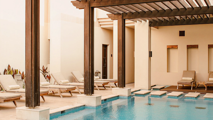 Set within the heritage district of Al Mareija, the courtyard pool at The Chedi Al Bait offers a slower setting away from the city’s pace. Shaded walkways and traditional architecture frame the space around the water.