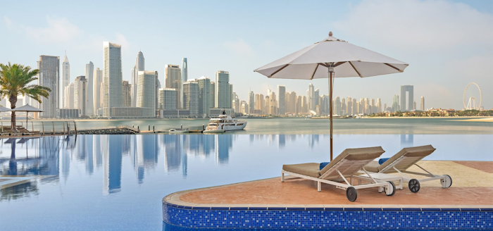 The beachside pool overlooks the Dubai Marina skyline, Palm Jumeirah and the Arabian Gulf, with plenty of space to stretch out for the day.