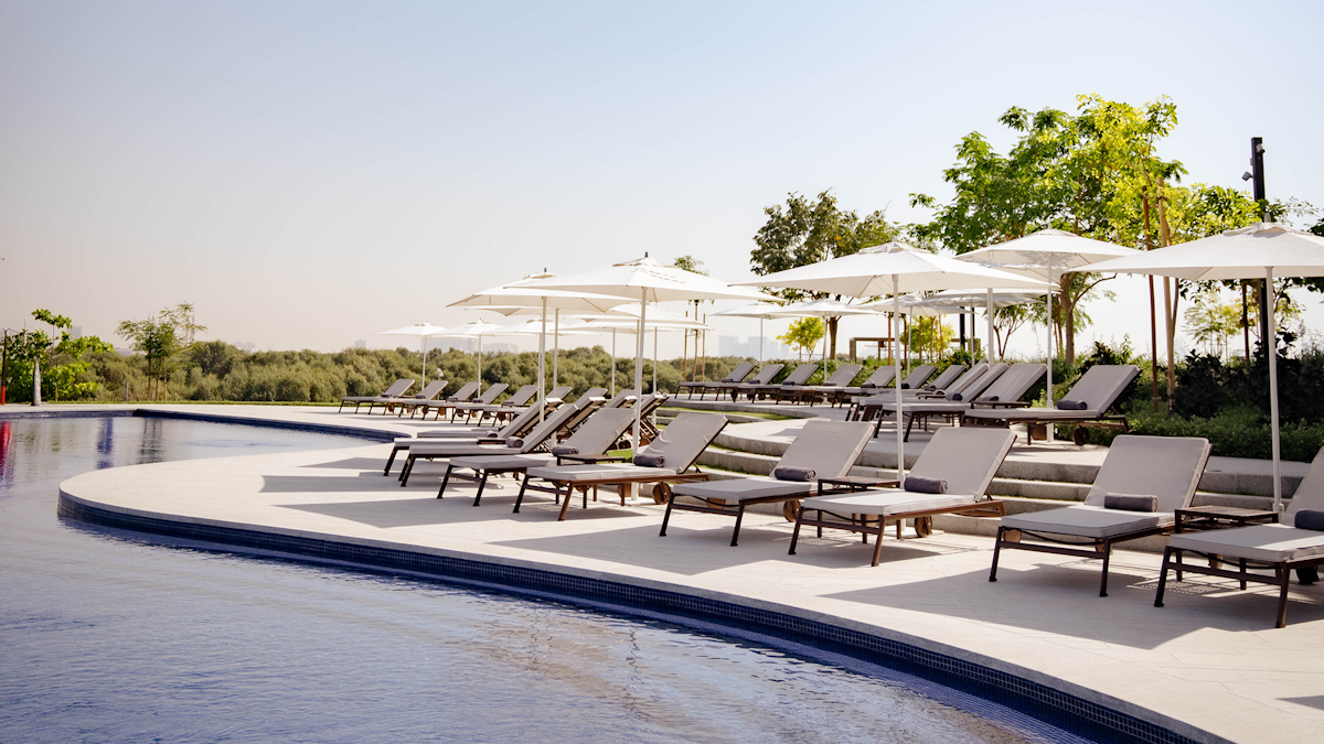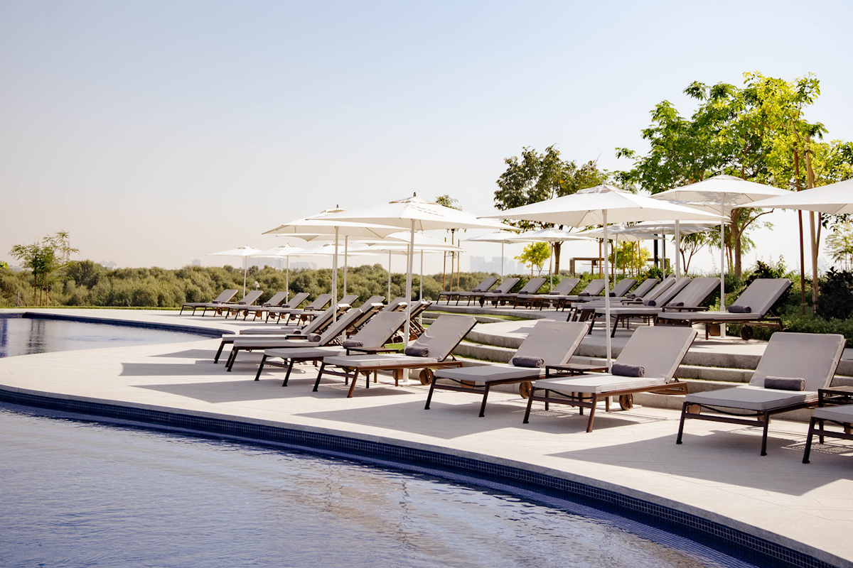 Pool time to tee time – this is where you serve, swing, sweat, and reset. Tucked between Ajman’s mangroves and fairways, Al Zorah Golf & Yacht Club feels calm and considered, with adults-only poolside lounging set one level above the course, looking out over open skies and greenery. Move from a slow morning by the water to an hour on the tennis courts, then stroll over to the Nicklaus-designed course for a round across wide, generous fairways. After your game, match, or swim, the sauna and refined changing facilities bring that quiet, club-like finish to your day. Take things to the terrace at The Restaurant as the sun drops behind the greens – all soft light, open views, and easy energy that make staying a little longer feel mandatory.