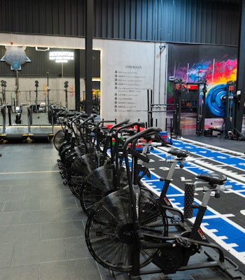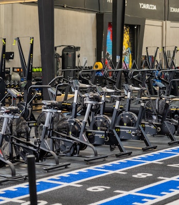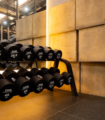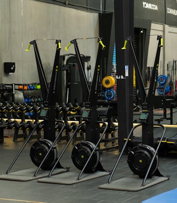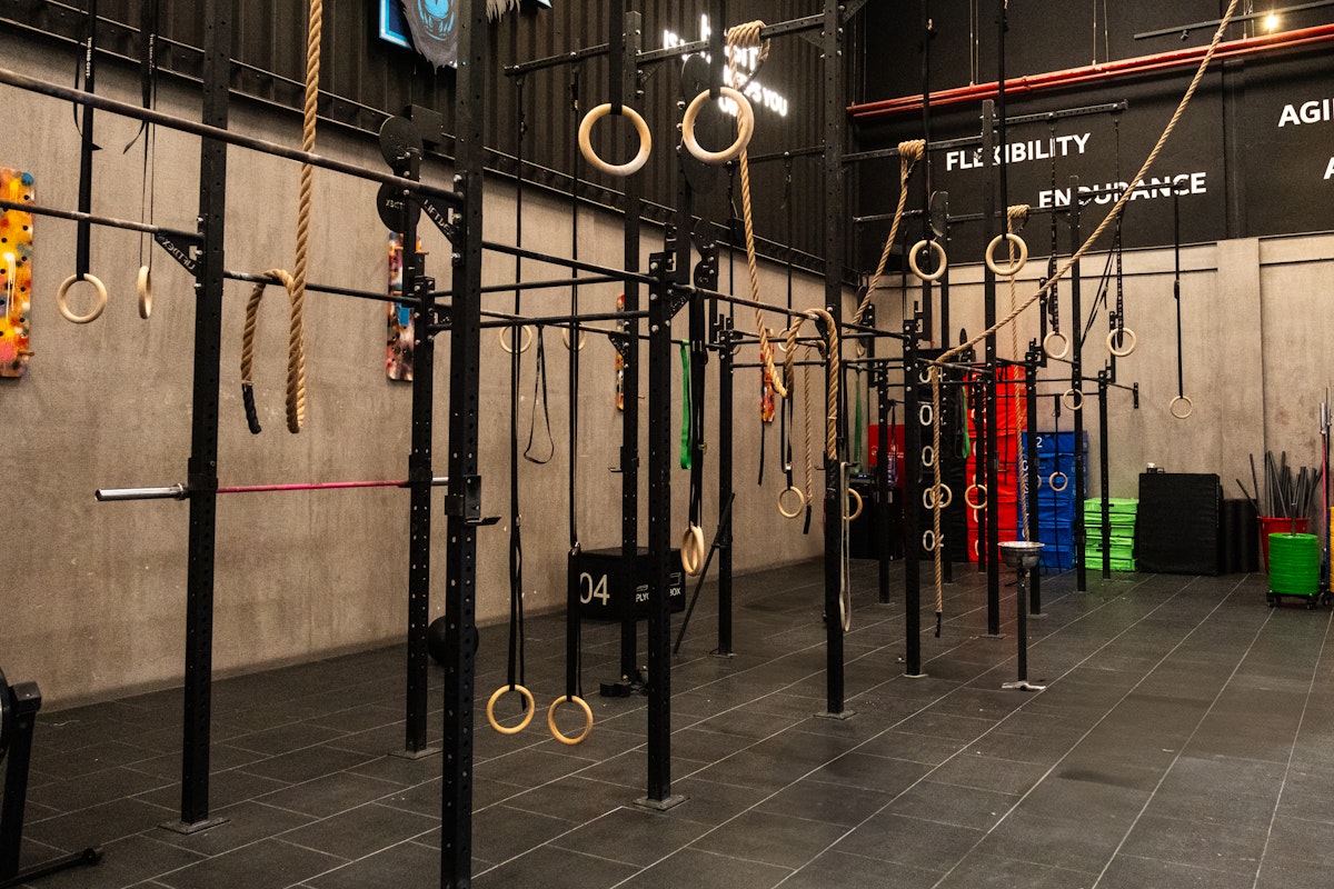 The class starts with a dynamic warm-up, including mobility exercises and three minutes on the SkiErg. Then, it’s into the workout: three rounds of different exercises. The class includes a mix of weightlifting, cardio, and bodyweight exercises. We used the functional rig, pulled up on the bars, worked with sandbags, and pushed ourselves on the rower. The layout is spacious, and the lighting gives you just enough focus to stay in the zone while you work hard.