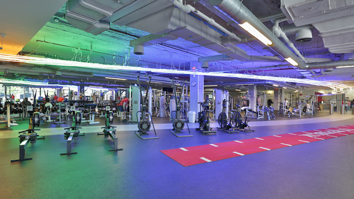 Spacious and bright, split into zones. The left side is the functional training area with a sled track, squat racks, and cardio machines. The right side is the weights zone with resistance machines and free weights. The cardio zone sits upstairs, overlooking the functional training area for an energising, open feel while you work out.