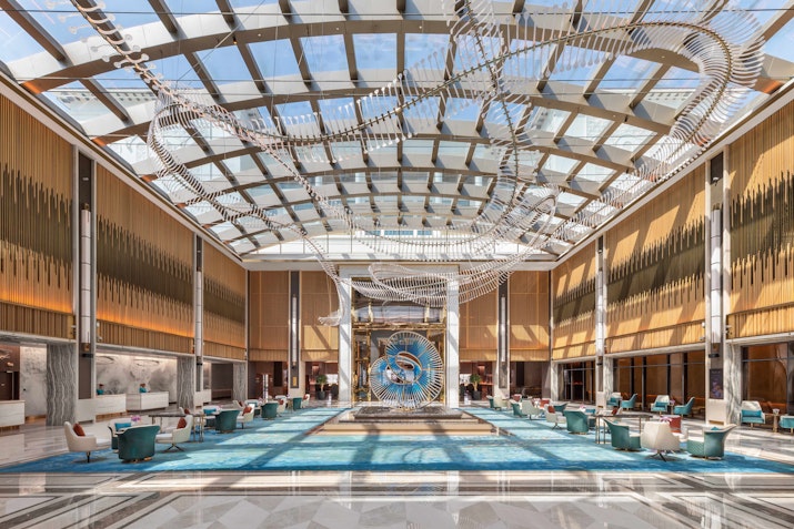 As you arrive at the valet, you’re greeted by jaw-dropping views of the Burj Al Arab and the Downtown skyline. Step inside, and the lobby sets the tone for your day with light flooding in through the glass ceiling and a calm vibe. Added details like fresh flowers, a grand piano in the corner, and art displayed throughout, with unique pieces and textures, create an elevated feel.