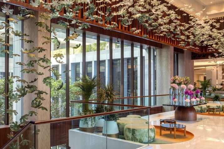 The standout feature of the lobby is the chandelier designed by Kolektiv Ateliers, a Dubai-based concept, inspired by Czech glassmaking traditions. This breathtaking piece drops from the ceiling in a cascade of 1,000 handcrafted bohemian glass pieces in shades of green, creating a one-of-a-kind, nature-inspired masterpiece.