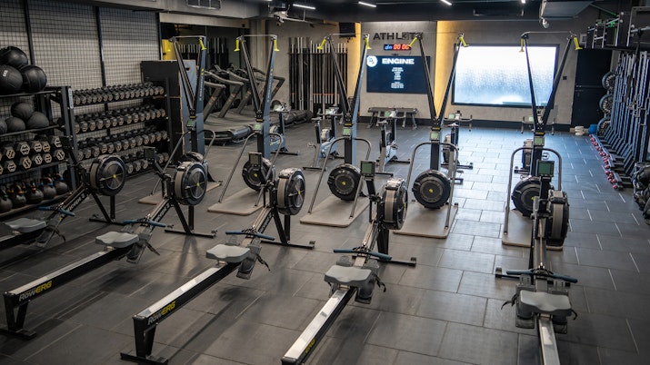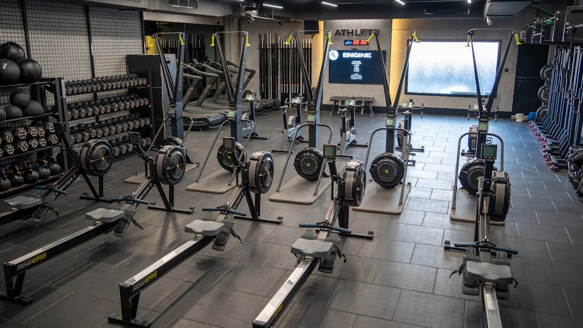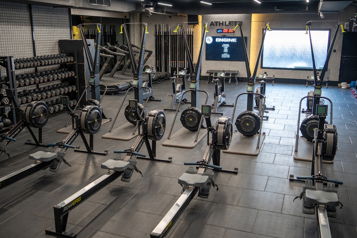 The layout is deliberate. Squat racks when you need them, a sled track, SkiErgs and rowers, Assault Runners, CO2 bikes, and an Echo Bike. Not forgetting the sandbags, ropes, and GENEJACK bands for strength and mobility. LIFTDEX weights range from 5kg to 30kg, and kettlebells from 12kg to 32kg. It’s functional and hybrid equipment chosen for progression.