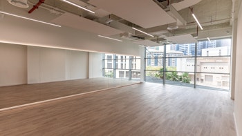 The Pilates and functional studio feels calm and bright, with floor-to-ceiling windows, warm wooden floors, and high ceilings that bring a soft, loft-style feel. It is contemporary, welcoming, and designed for everything from Pilates to morning mobility.