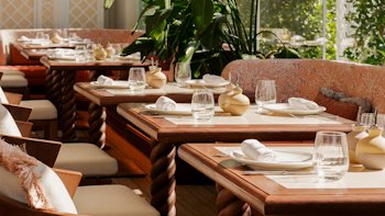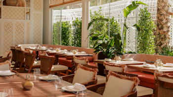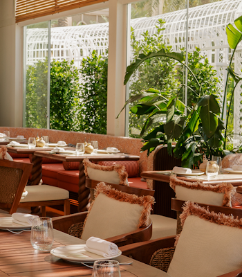 Fresh produce and seafood are displayed market-style, hinting at the quality before dishes even hit the table. The indoor dining space is layered with greenery, chic pink tile details, and a statement bar that’s made for long lunches and elegant dinners.