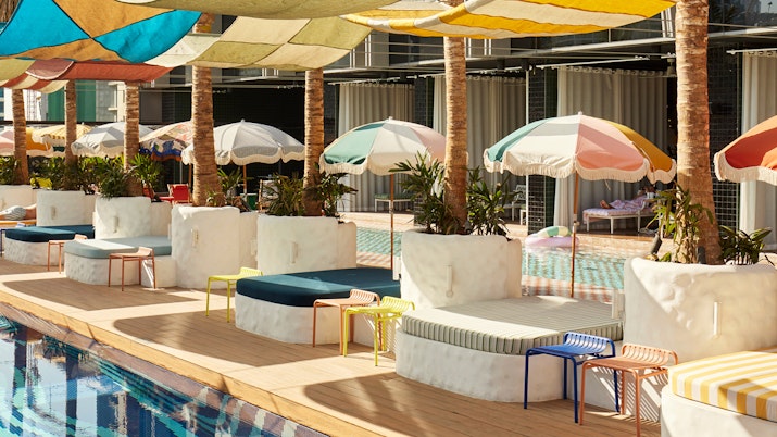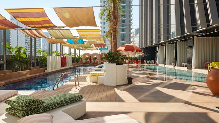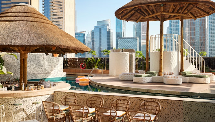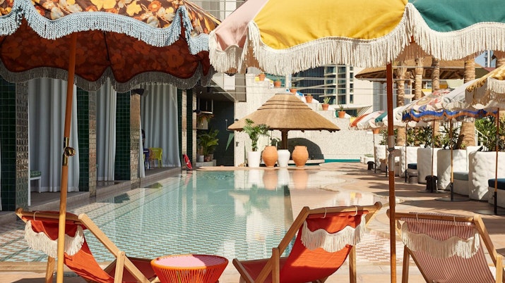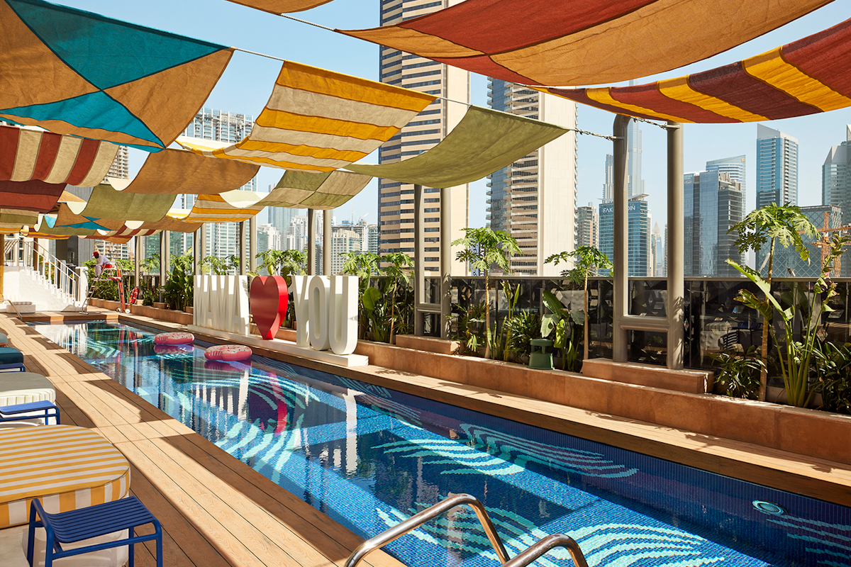 Mama Shelter Dubai takes poolside pretty to the next level. On the partially covered terrace of the third floor, you'll find four Insta-worthy pools, each designed for ultimate relaxation. Picture colourful fringed umbrellas, pink tiles, and a swim-up bar that invites you to sip in style. For families, there's a kids' pool complete with adorable mini cabanas. Whether you’re lounging on a sun-soaked sofa or a poolside bed, every corner offers a perfect spot to unwind. And for something extra special, one of the pools even features a semi-submerged bar, making every moment by the water feel like an escape.