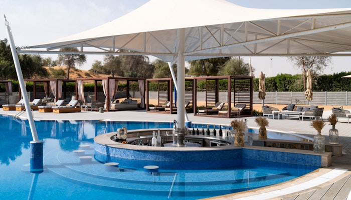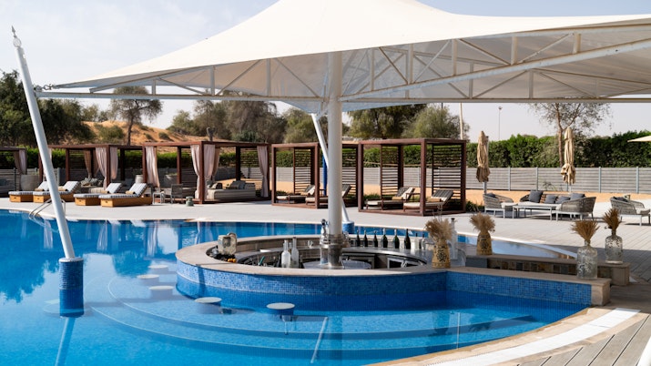 The main pool is everything you want from a desert daycay spot - calm and quiet. With nothing but sand on the horizon, it’s the perfect place to fully switch off, with a swim-up pool bar to cool down at.