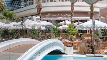French-Riviera-inspired beach life meets Dubai’s sunlit Palm West Beach. Think breezy umbrellas, plush loungers, and Mediterranean flavours as effortless as the sea breeze.
